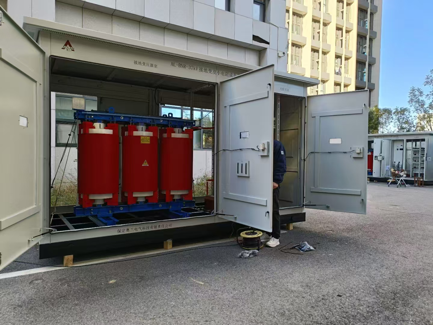 赤城县风储一体化创新示范工程的接地变压器及小电阻成套装置,设备安装在升压站户外配电区内;接地变与接地电阻共用一个箱体,但需各自分隔成独立小室,箱体内包含伴热(能满足户外温度要求)、照明、加热除湿等附属设备。项目所在地最低环境温度低于-25℃时,户外布置干式变压器在箱体内配置伴热设备,以满足干式变压器户外运行要求。