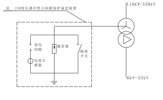 AL-JXB型变压器中性点间隙接地保护装置集隔离开关、氧化锌避雷器、放电间隙和电流互感器等电气设备于一体的成套设备,具有体积小,安装调试方便,可靠性高的特点。